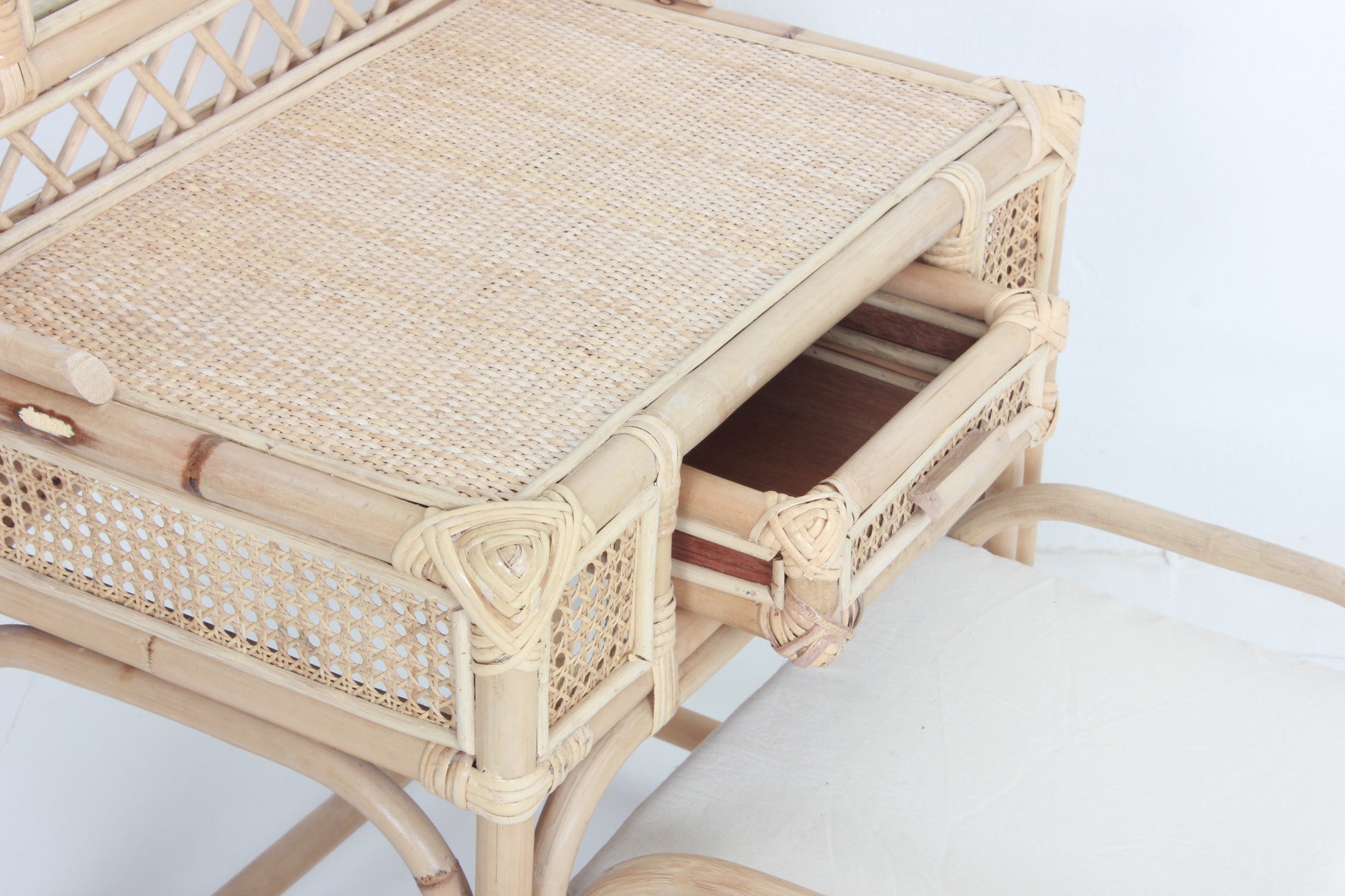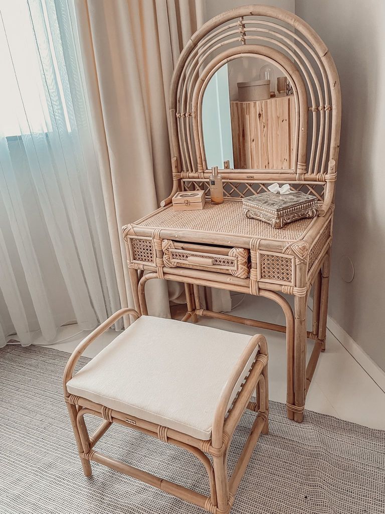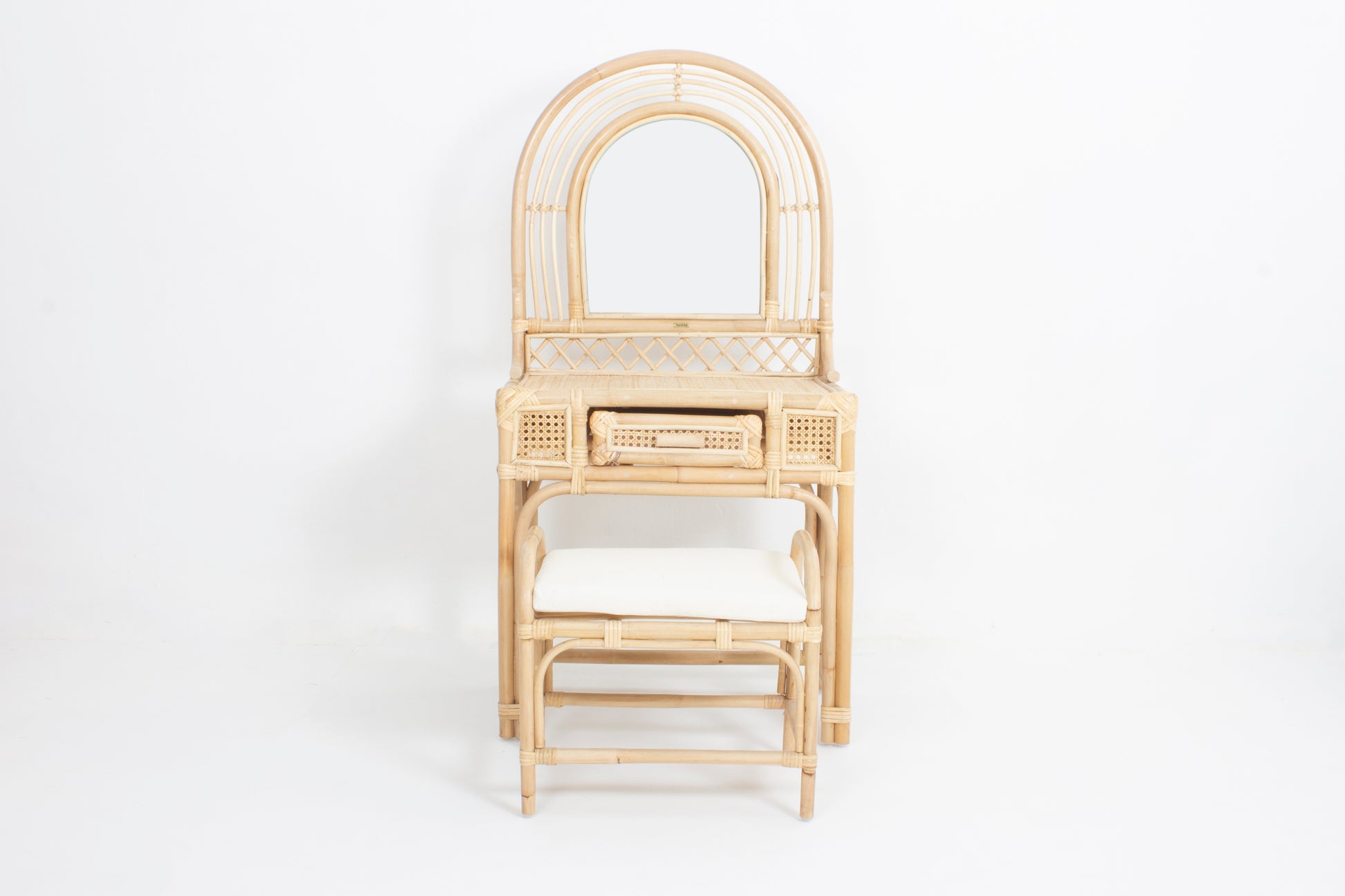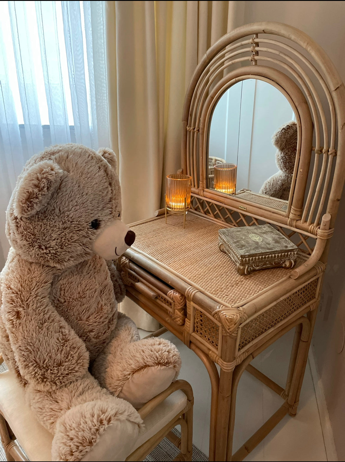 De kaptafel straalt een tijdloze elegantie uit met zijn zorgvuldig gevlochten rotan en delicate details. Het charmante ontwerp voegt een vleugje speelse verfijning toe aan elke meisjeskamer, terwijl de praktische lade ervoor zorgt dat al haar favoriete spulletjes netjes georganiseerd blijven.
